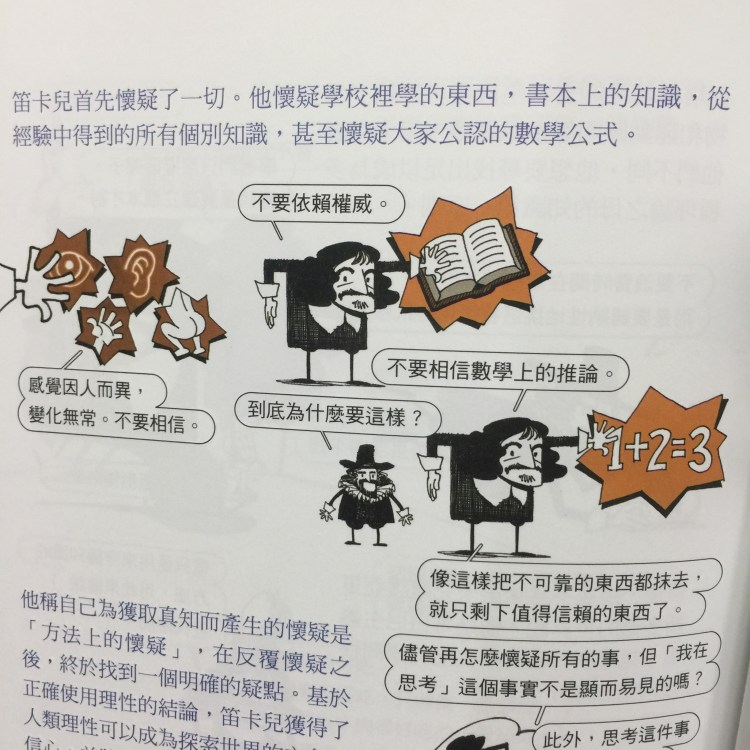 這句話後來被很多人Kuso成很多說法,什麼我吃故我在、我胖故我在…,其實好多名人解讀了「我思,故我在」,說老實話各有各的理,「存在」這個概念在哲學界是具爭議性的,但我著重於理性思考的這個面向,徹底的懷疑一切,看到這裡我都忍不住沸騰,真的很棒啊‼‼因為連我自己都習慣活在既定的框架下,而出名的科學家們大多是跳脫框架從「懷疑開始理性思考」,雖然覺得孩子們常常問我「為什麼是這樣?」很煩,但是現在大家都知道現代多的是填鴨式教育,缺的是會想知道1+1=2可能以外的孩子。