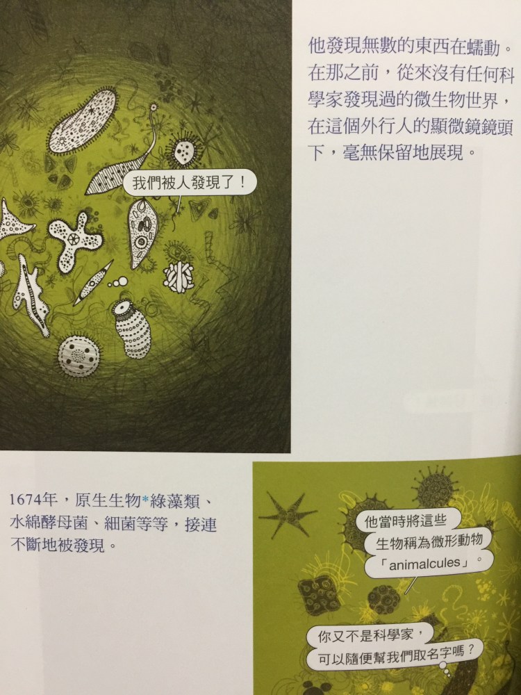 在過去的科學家都是有目的性地對許多動、植物有生命體的作為觀察對象,但是一介商人的雷文霍克則是喜歡到處亂看,雨滴、大便…等,在他特製可放大200倍的顯微鏡下發現了微生物呢。