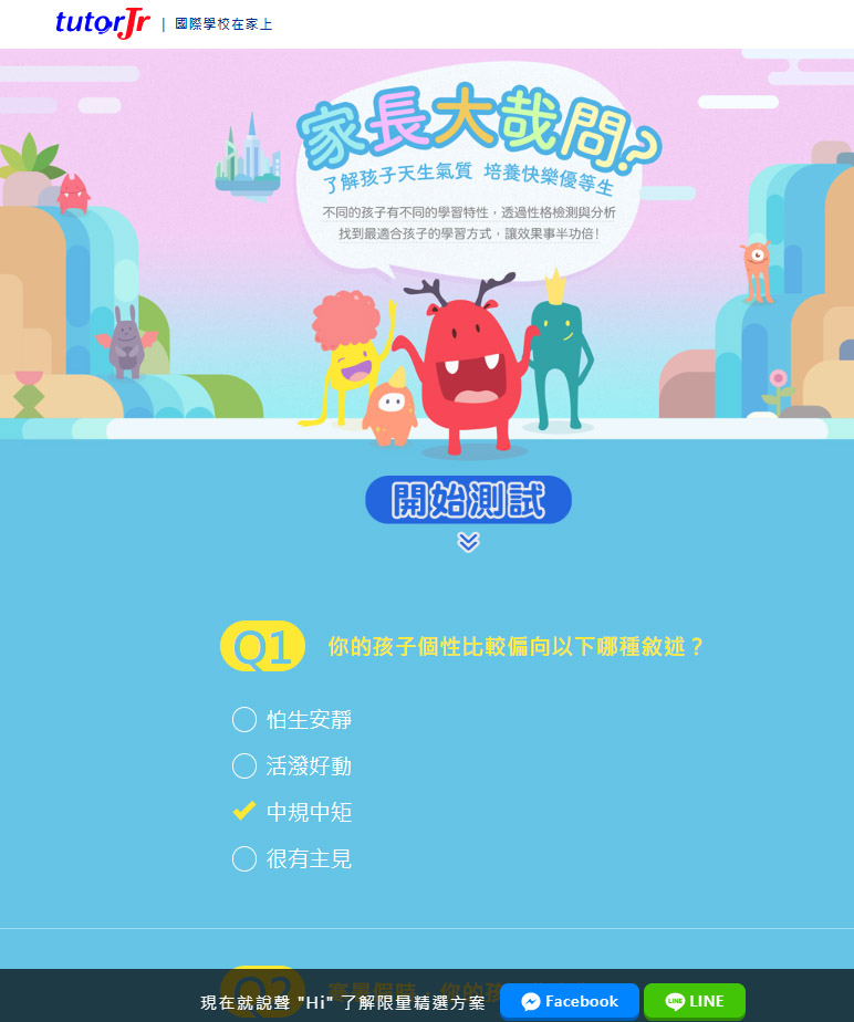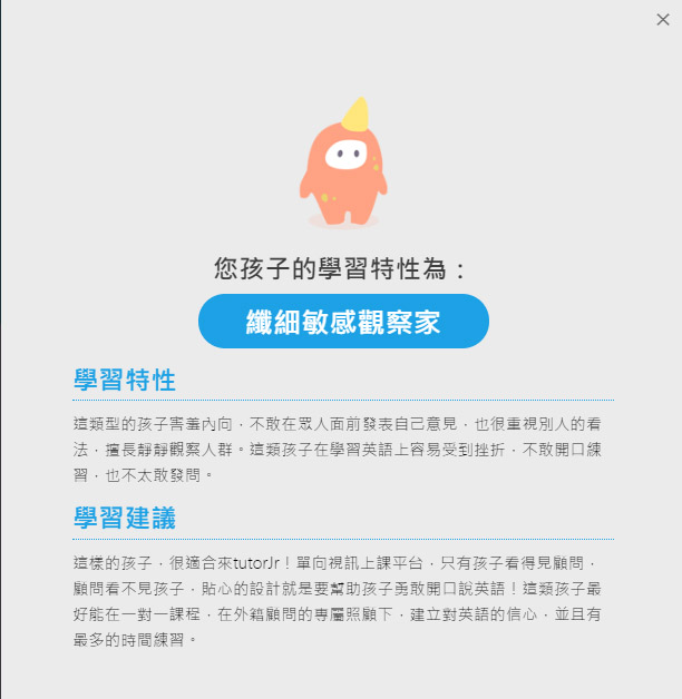 因為那次我悉心取經,加上如今家裡面臨必須幫孩子們在英語聽力口說程度亡羊補牢的時候,於是我再一次先報名體驗,看看大寶能和外師一對一聽說到什麼程度,事前還先在官網上做了性格測驗,想知道究竟大寶適合什麼樣的學習模式。