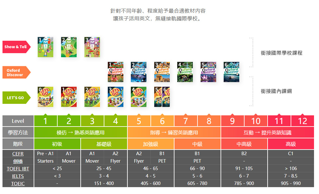 不過我參考了官網的課程教材一覽表後,才發現有Level56789的話對照TOEIC的程度都能4-800分😂,很多出社會的職場人士都不一定有TOEIC四百分的程度呢!另外tutorJr使用的教材是牛津大學出版社獨家線上授權,看完這樣的課程規劃一覽,真的是連我也心動,難怪在網評上會有非英母語國家最暢銷教材的評價。