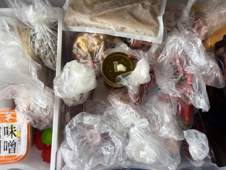 原來是沒有媳婦兒在家操持煮飯,長輩自煮的日子,都是把買來的食材一一用塑膠袋分門別類(?)不但分得非常凌亂,還有很多空間被多出來一截的塑膠袋佔住,而且塑膠袋讓食材冰得歪七扭八,好多畸零地的空間都被浪費掉。長輩用不慣看不見內容物的不鏽鋼保鮮盒,也嫌真空保鮮袋打開取材部分,又要再重複真空麻煩,寧願塑膠袋這樣捆捆解決。只有公婆兩個人在家住的三個多月,竟然把冰箱養得超虛胖,細節多虛胖如圖↓