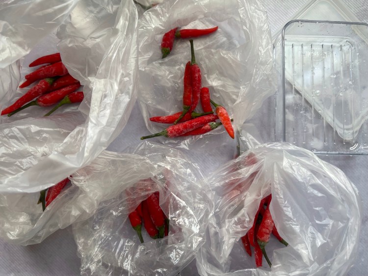 (左圖)可能是每次菜販熱心送的一小包辣椒?有六、七包呢!袋子裡有不少沒擠出的空氣,變成小胖袋。