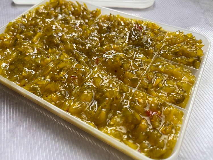 Silicook蒜泥分裝盒,真心推薦起碼要入手6-10盒,除了薑末、蒜末,意外發現分裝部分無法一次食用完的配料類罐頭也很適合,像是我在好市多買的酸黃瓜罐頭,明明剩餘的量不多,但它一大瓶卡在冷藏好佔空間,這次索性裝在蒜泥分裝盒中放在冷凍超方便。