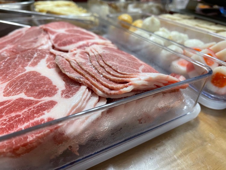 (右圖)從一個大塑膠袋撈出的一包包也裝塑膠袋的五花肉,每一團還不規則形,而且大塑膠袋外袋下還有四包五花肉被壓著,因為長輩以為沒了就又多買。