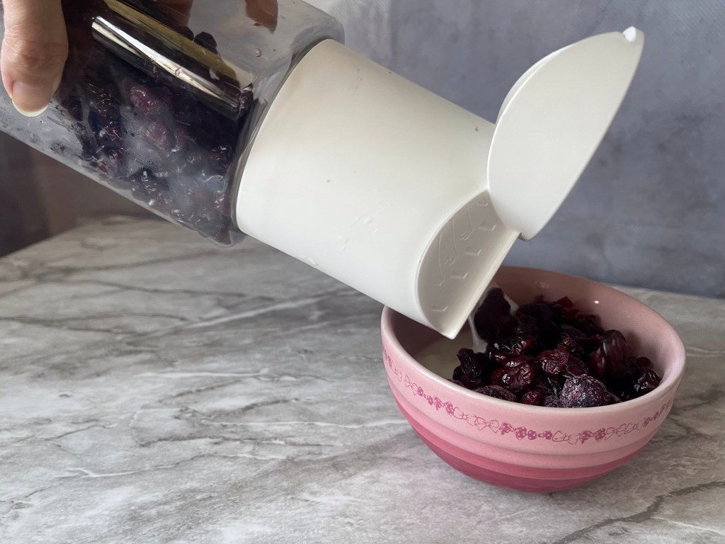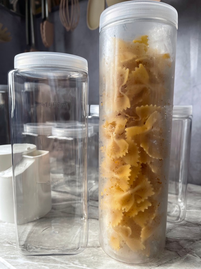 方型直筒收納盒我偏好用在乾貨和果乾保存,像是moin家每天打蔬果汁必加的枸杞、無糖優格會加的減糖蔓越果乾,搭配義大利麵蓋真的好方便,不用像過去存放原包裝的夾鏈袋,每次取用難用,封口又容易疏忽沒密封好。