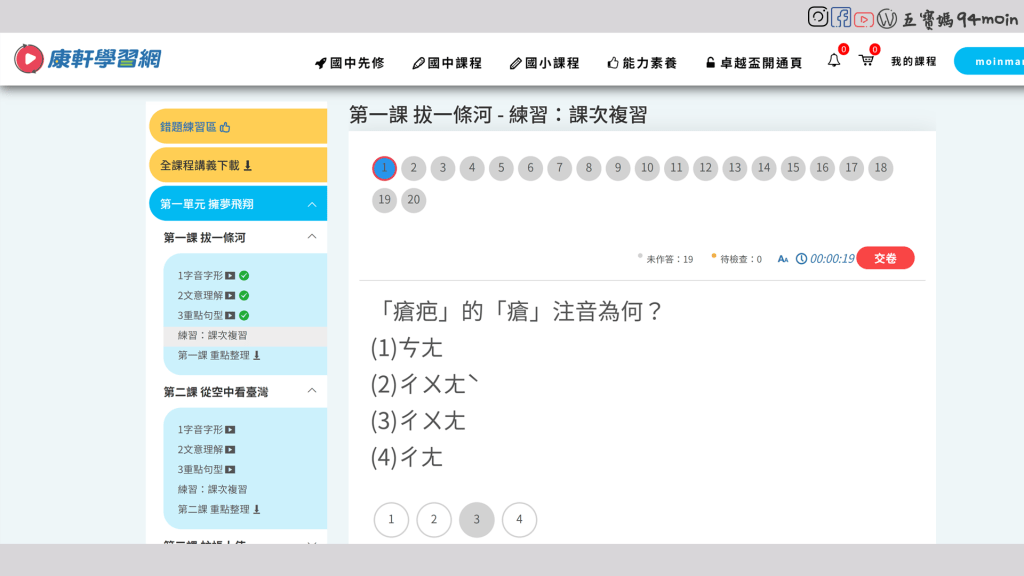 循序漸進的線上試題測驗-有小單元的練習卷、全課複習卷,選單底部還有段考區的試卷,透過題目卷漸進的難度讓孩子逐步吸收和思考。