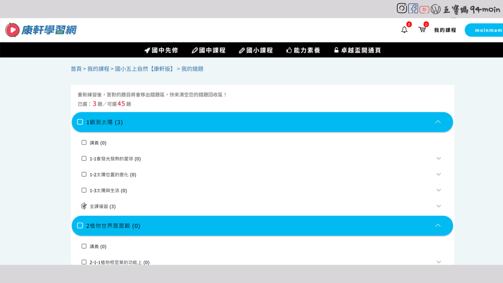 當帳號裡的體驗課程被開通,才發現有的課程版本和大二寶學校課本不同,不過康軒學習網中有包含南一和翰林版本的課程包可買,但是我大二寶一起討論,乾脆趁體驗期間內看看別的版本教程有什麼不一樣,她們說反正日常做PaGamO的題庫也是各家版本都有做,於是就都同意在康軒學習網裡用康軒版本來做課後的居家安親。