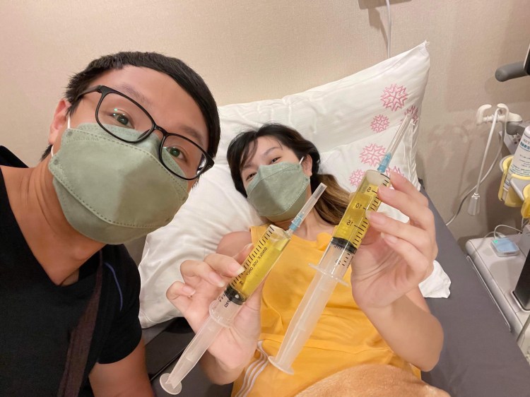 但因為沒任何不適,我就壯膽起來把目光放回腹部,開始觀看抽羊水的過程,只會感覺埋針的那裡好像卡了一個什麼(廢話,就針啊),接連著看護理師幫我抽了兩管,一管是做傳統染色體檢查、一管是做慧智全方位複合式晶片2.0,真的是好特別,像是淡淡的尿液一樣欸😳