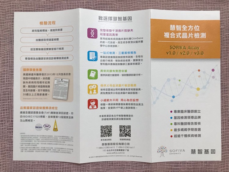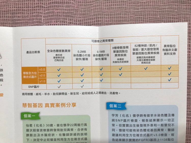 很順利的,昨天惱公沒被公事拖太久,掛完號後,護理師就跟我確認想做哪一款羊水基因晶片,慧智全方位複合式晶片有1.0、2.0、3.0,在取捨下,我選擇了2.0來做,因為我貌似在惱公的眉宇間看到他對3.0的費用啊嘶了一下😆(費用和簡章如下圖)