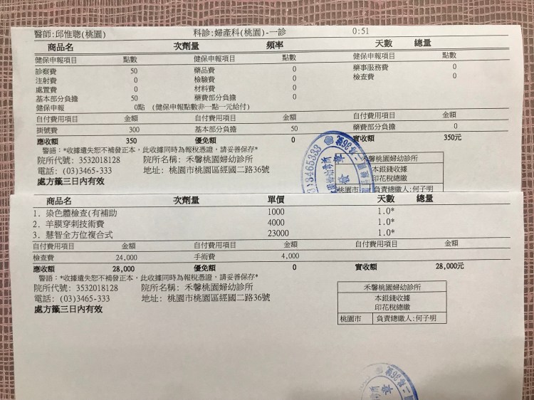 來附上這次羊膜穿刺、染色體檢查、慧智全方位複合式晶片2.0結帳時的明細收據💰可以用信用卡結帳很方便💳