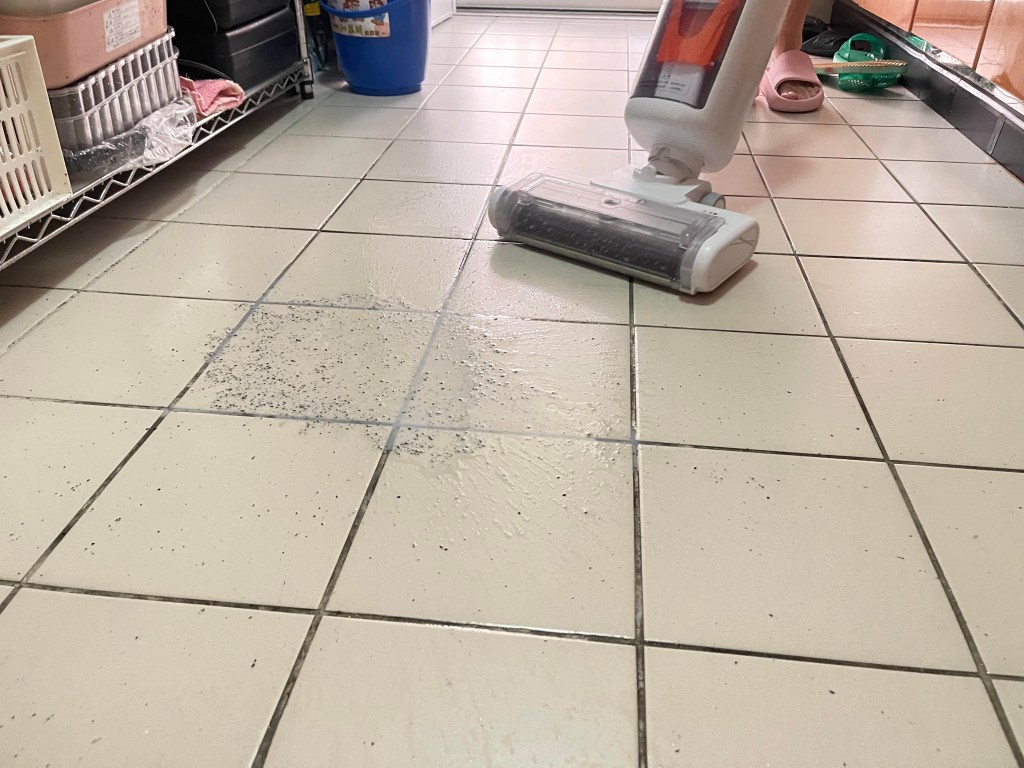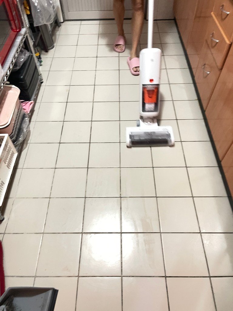 反正剛好遇到芝麻牛奶被翻了,索性悠哉拍照做個記錄,我先用乾吸模式把芝麻牛奶的區塊都吸乾後,我才按下拖地供水的按鈕💧吸頭上會有供水指示燈閃現綠燈,要停止供水就再按💧濕度是可以自行控制的。最後我乾脆把廚房地板都拖一拖,主要是因為芝麻牛奶比較黏,雖然速吸拖有濕拖同時吸塵功能,但是一開始就使用供水,無疑加大芝麻牛奶擴散範圍,若當下是咖啡之類的,我可能就直接開啟濕拖模式了。