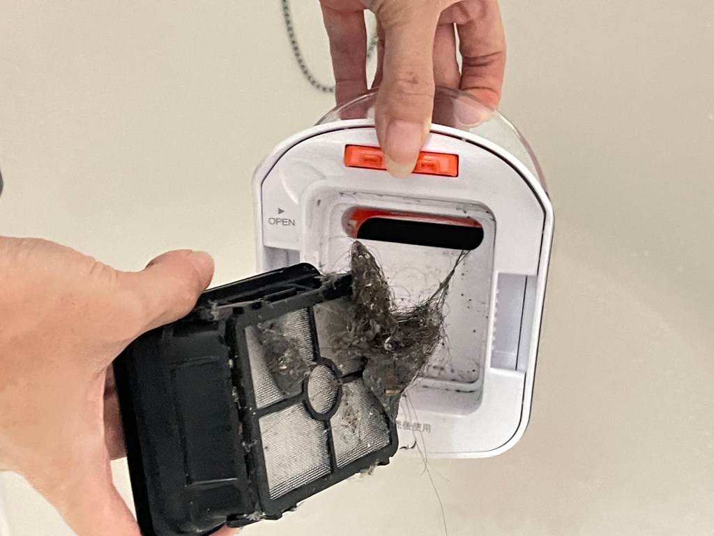 乾吸模式下,拿起濾網就能看到灰塵毛髮髒污的聚集處。