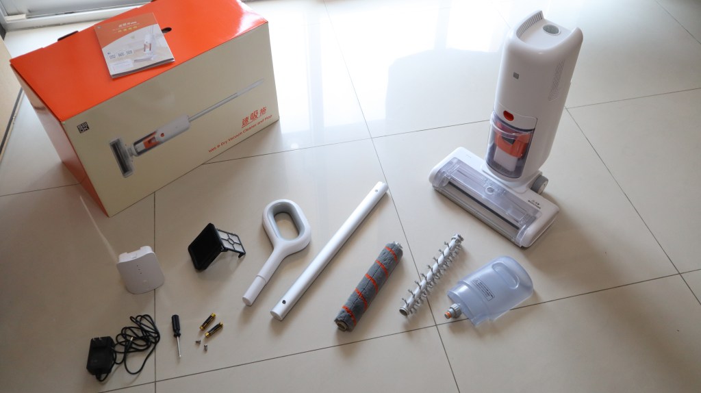 SWDK速吸拖產品內容物:手持握把控制器、兩種滾刷(科技棉毛、鬃毛刷)、污水箱、淨水箱、專用鋰電池*1、充電器、電池*2、兩個HEPA的濾網(其一已安裝在污水箱上)、說明書。