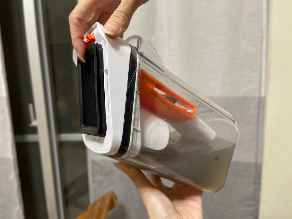 .要注意污水箱是否已經滿了-雖然污水箱容量不小,但當污水箱看到浮標上的Max字樣,記得先將污水箱倒掉,不然在機器傾斜使用時,讓濾網浸濕會影響吸力,就會有水怎麼都吸不起來、拖不乾的現象。
