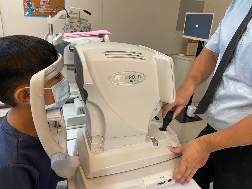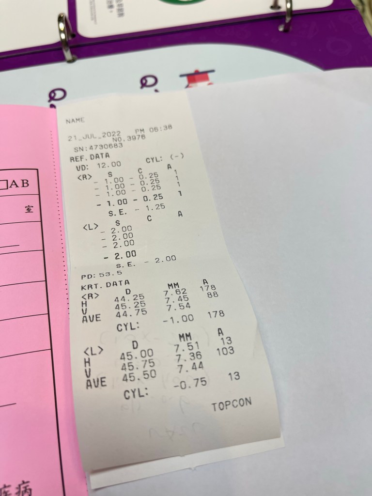 和惱公帶到隔壁區的 晴美眼科診所,診所護理驗光師先用儀器進行了裸視視力檢查,結果兩眼的視差我覺得有點大🤦🏻♀️一眼100一眼175,難怪他偏得很誇張,後悔我之前沒積極帶他治療。